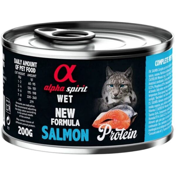 Alpha Spirit konservai visavertis pašaras katėms su lašiša.Sudėtis: lašiša 94%, daržovės, želatina, malti cukriniai runkeliai, prieskonių ir pagardų perdirbimo produktai, maniokai.Priedai/kg: Maistiniai priedai: vitaminas A (3a672a) 7471TV, vitaminas D3 (3a671) 445TV, vitaminas E (3a700) 149TV, mineralai: 3b503 (manganas 12mg), 3b103 (geležis 29mg), 3b405 (varis 2.3mg), 3b603 (cinkas 30mg), 3b201 (jodas 0.5mg), taurinas 0.4%.Analitinės sudedamosios dalys: žali baltymai 11.8%, žalia ląsteliena 1%, žali riebalai 5.8%, žali pelenai 1.8%, drėgnis 73%, kalcis 0.22%, fosforas 0.17%. Metabolizuojama energija: 1258Kcal.Maitinimo rekomendacija: Dienos maitinimo normas žiūrėti ant pakuotės (kiekiai yra orientaciniai). Visada augintinis turi turėti šviežio ir švaraus vandens. Laikyti produktą vėsioje ir sausoje vietoje, apsaugoti nuo saulės spindulių. Produktas paruoštas naudoti, šildyti nebūtina. Atidarius galima laikyti iki 24valandų šaldytuve.