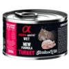Alpha Spirit konservas – visavertis pašaras sterilizuotoms katėms su triušiena.Sudėtis: vištiena 63% (mėsos 70%, kepenys, širdis), triušiena 30%, (60% mėsa, kepenys, širdis), daržovės, želatina, malti cukriniai runkeliai, prieskonių ir pagardų perdirbimo produktai, maniokai.Priedai/kg: Maistiniai priedai: vitaminas A (3a672a) 7471TV, vitaminas D3 (3a671) 445TV, vitaminas E (3a700) 149TV, mineralai: 3b503 (manganas 12mg), 3b103 (geležis 29mg), 3b405 (varis 2.3mg), 3b603 (cinkas 30mg), 3b201 (jodas 0.5mg), taurinas 0.4%.Analitinės sudedamosios dalys: žali baltymai 10.4%, žalia ląsteliena 1.2%, žali riebalai 5.9%, žali pelenai 2%, drėgnis 79.1%, kalcis 0.22%, fosforas 0.17%. Metabolizuojama energija: 1003Kcal-4197Kj.Maitinimo rekomendacija: Dienos maitinimo normas žiūrėti ant pakuotės (kiekiai yra orientaciniai). Visada augintinis turi turėti šviežio ir švaraus vandens. Laikyti produktą vėsioje ir sausoje vietoje, apsaugoti nuo saulės spindulių. Produktas paruoštas naudoti, šildyti nebūtina. Atidarius galima laikyti iki 24 valandų šaldytuve.