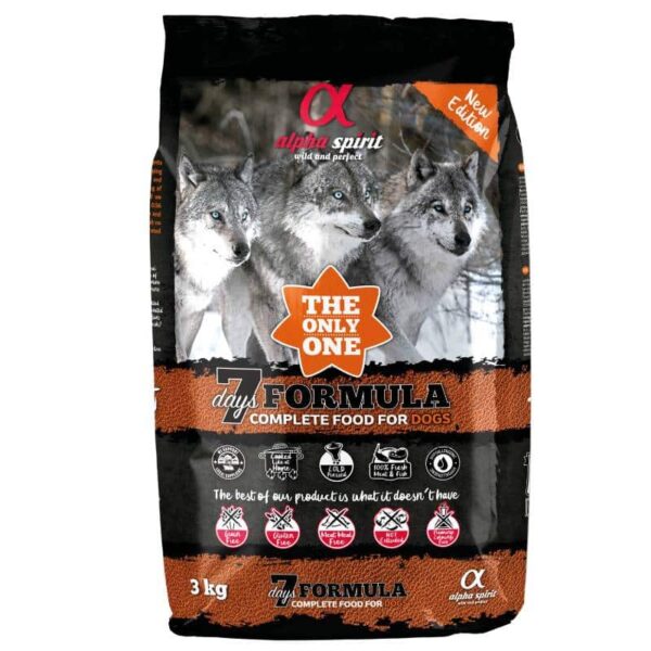 ALPHA SPIRIT 7 DAYS FORMULA – visavertis pašaras visų veislių suaugusiems šunims.Sudėtis: šviežia kiaulių mėsa 45%, šviežia vištų mėsa 25%, šviežia žuvis 10% (sardinelė (Sardinella aurita), skumbrė (Scomber scombrus), stauridė (Trachurus spp.), sardinė (Sardina pilchardus), šviežios kiaulių kepenys 5%, hidrolizuotas krakmolas, kiaušiniai, cukriniai runkeliai (Beta vulgaris), alaus mielės (Saccharomyces ceevisiae), saldžiosios bulvės, bananai, prieskoninės žolelės (kmynas (Carum carvi), kuminas (Cuminum cyminum), šalavijas (Salvia officinalis), ciberžolė (Curcuma longa), imbieras (Zingiber officinale).Analitinės sudedamosios dalys: žalių baltymų 29,5%, žalių riebalų 2%, žalios ląstelienos 15%, žalių pelenų 8%, drėgnio 16%, kalcis 1.5%, fosforas 1,2%, Omega-3 polinesočiosios riebalų rūgštys EPA+DHA (eikozapentaeno ir dokozaheksaeno rūgštys) 2000mg.Priedai/kg: maistiniai priedai: taurinas 3000mg, gliukozaminas 4400mg, geležis 70mg. Metabolizuojama energija per kg: 3613 kcal/15117 kj.Visos analitinės sudedamosios dalys yra naturaliai gaunamos iš žaliavų, jos nebuvo dirbtinai pridėtos. Tai unikalios formulės pašaras, todėl maitinimo normos gali kisti priklausomai nuo amžiaus ir gyvenimo būdo. Atidarius suvartoti per 15 dienų. Patariame pašarą keisti palaipsniui. Visada gyvūnui palikite švaraus vandens dubenį. Laikyti šaltoje, tamsioje vietoje. Pakuotę laikyti gerai uždarytą.
