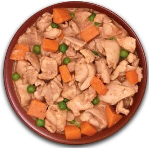 Sudėtis: šviežia vištiena 97%, batatai, žirniai, morkos, prieskoniai.