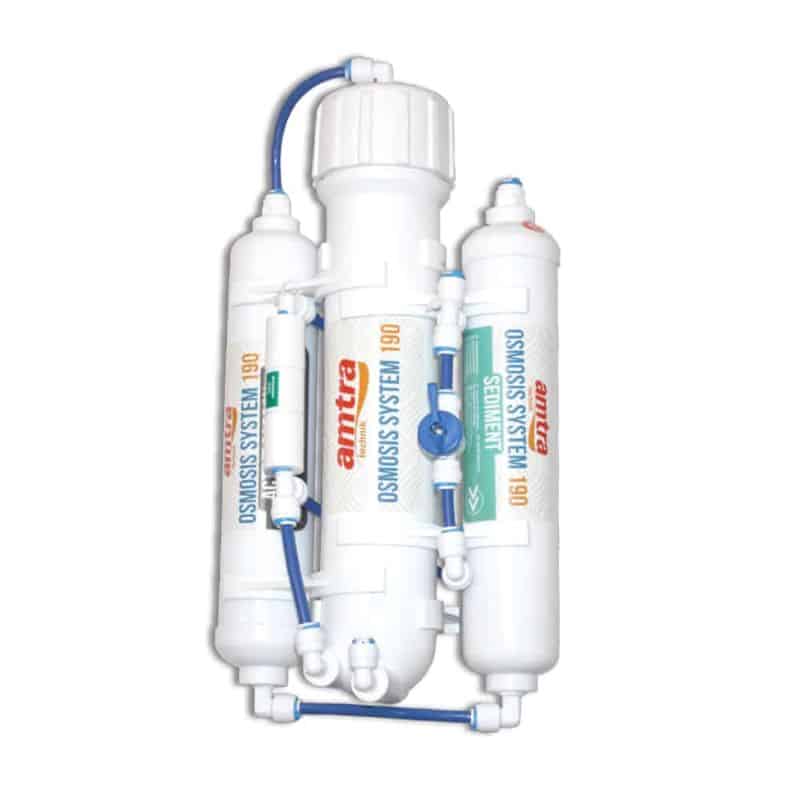 Praktiška ir kompaktiška sistema osmosinio vandens gamybai namuose.”AMTRA OSMOSIS SYSTEM 190″ yra 3 pakopų atvirkštinio osmoso sistema, kuri iš vandentiekio vandens gamina osmosinį vandenį, t. y. vandenį su labai mažu ištirpusių druskų kiekiu (laidumas 10-40 μS). Tą patį vandenį (kurio KH ir GH vertės artimos nuliui) galima naudoti tiesiogiai akvariume tik tam, kad būtų atkurtas tinkamas išgarinto vandens lygis (išgarinamas tik grynas vanduo, akvariume lieka ištirpusių druskų, kurios didina vandens kietumą, todėl išgarintą vandenį būtina atkurti osmosiniu vandeniu be druskų). Osmotinį vandenį, tinkamai sumaišytą su jūros druska arba specifinėmis druskomis, skirtomis gėlam vandeniui, galima tiesiogiai naudoti kaip vandenį naujiems akvariumams ruošti ir reguliariai keisti vandenį juose.