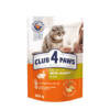 Energetinė vertė 100 g pašaro: 347,43 kJ (83,04 kcal). Laikyti sausoje vietoje, nuo +6 ºC iki +30 ºC temperatūroje. Atidarius pakuotę laikyti šaldytuve ir suvartoti ne ilgiau kaip per 48 valandas. Pašaro porcija turi būti kambario temperatūros. Pašaras turi būti palaipsniui įvedamas į naminio gyvūnėlio mitybą (bent jau per pirmąsias 5 dienas). Visada turi būti įpilta švaraus ir šviežio vandens. Individualios šėrimo normos gali skirtis atsižvelgiant į amžių, veislę, aktyvumo lygį ir naminio gyvūnėlio buvimo aplinką. Derinkite šėrimą su sausu pašaru CLUB 4 PAWS suaugusioms katėms.