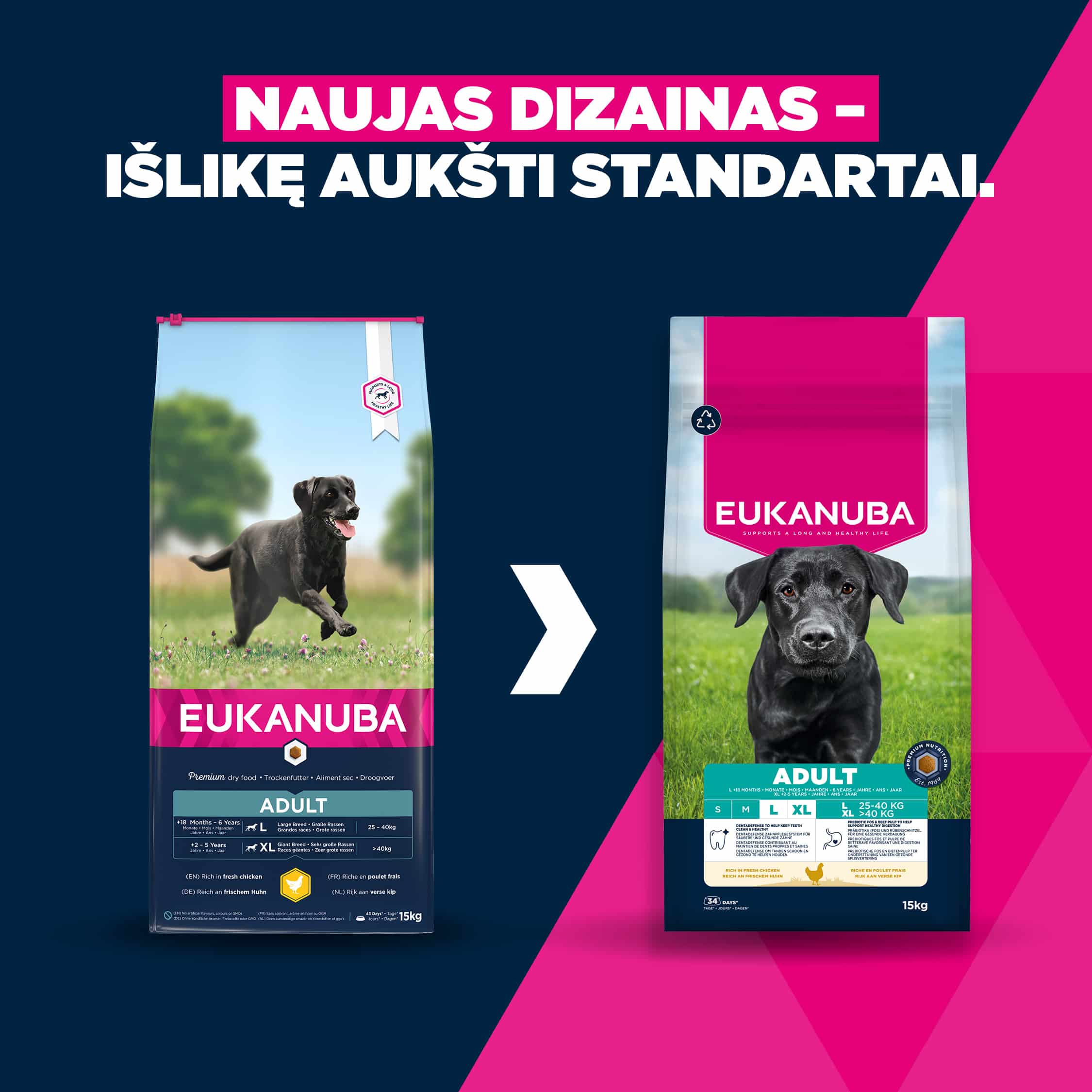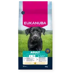 Eukanuba sauso ėdalo granulėse gausu šviežios vištienos, jis puikiai tinka suaugusiems didelių veislių šunims nuo 18 mėnesių iki 6 metų (arba nuo 2 iki 5 metų – milžiniškų veislių šunims). Pritaikytas prebiotikų FOS ir cukrinių runkelių minkštimo skaidulų mišinys skatina sveiką virškinimą. Be to, dėl natūralių omega 6 ir omega 3 šaltinių Eukanuba granulės padeda išlaikyti sveiką odą ir blizgantį kailį. Ėdale taip pat yra gliukozamino ir kalcio, kurie padeda palaikyti sveikus sąnarius ir stiprius kaulus, taip pat antioksidantų, vitaminų E ir C, skirtų palaikyti šuns imuninę sistemą. Unikalios šešiakampės Eukanuba granulės ir DentaDefense dantų priežiūros sistema ilgainiui palaiko švarius, sveikus dantis. L-karnitinas, esantis sausame Eukanuba ėdale, padeda mažinti kūno riebalų kiekį ir išlaikyti optimalų jūsų šuns svorį, mažiau apkrauna sąnarius. Ėdalas yra 100 % visavertis ir subalansuotas. Pažangi mityba suaugusiems didelių veislių šunims, palaikanti optimalią kūno būklę ir gerovę visą gyvenimą.
