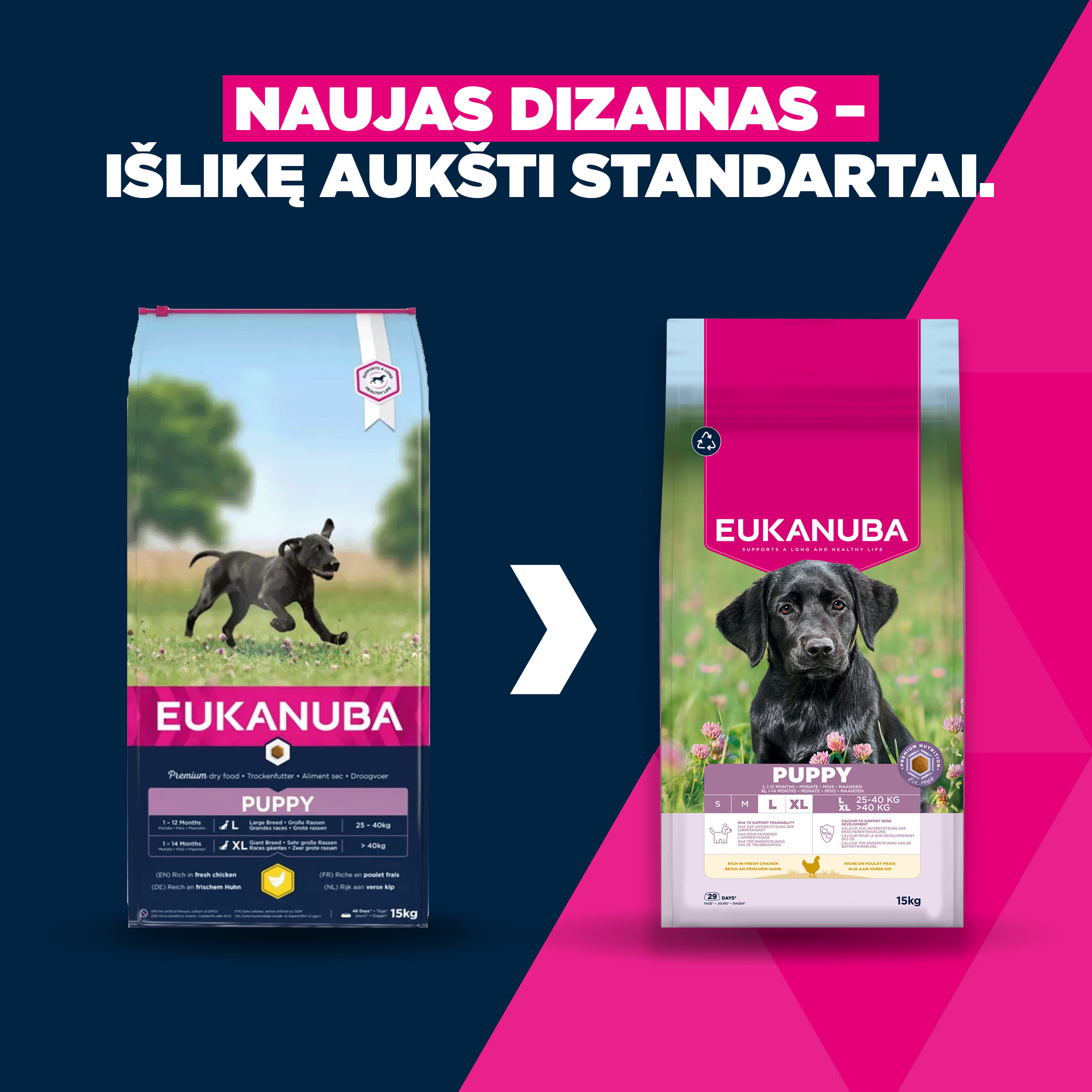 Eukanuba sausame ėdale gausu šviežios vištienos. Jis puikiai tinka didelių veislių šuniukams nuo 1 iki 12 mėnesių (arba milžiniškų veislių šuniukams nuo 1 iki 14 mėnesių). Rinktinės sudedamosios dalys suteikia naudingų medžiagų šuniuko augimui ir vystymuisi. Eukanuba sausame ėdale yra DHR, kuri skatina šuniukus mokytis ir būti imlesniems dresūrai, taip pat kalcio, kurio reikia kaulų vystymuisi. Specialus skaidulų mišinys, kuriame yra prebiotikų FOS, MOS ir cukrinių runkelių minkštimo, padeda palaikyti sklandų virškinimą, o antioksidantai vitaminas E ir C palaiko šuns imuninę sistemą. Dėl natūralių omega 6 ir omega 3 šaltinių Eukanuba granulės yra naudingos sveikai odai ir blizgančiam kailiui. Be to, unikalios šešiakampės Eukanuba granulės ilgainiui palaiko švarius, sveikus dantis. Ėdalas yra 100 % visavertis ir subalansuotas. Pažangi mityba didelių veislių šuniukams, palaikanti optimalią kūno būklę ir gerovę visą gyvenimą.