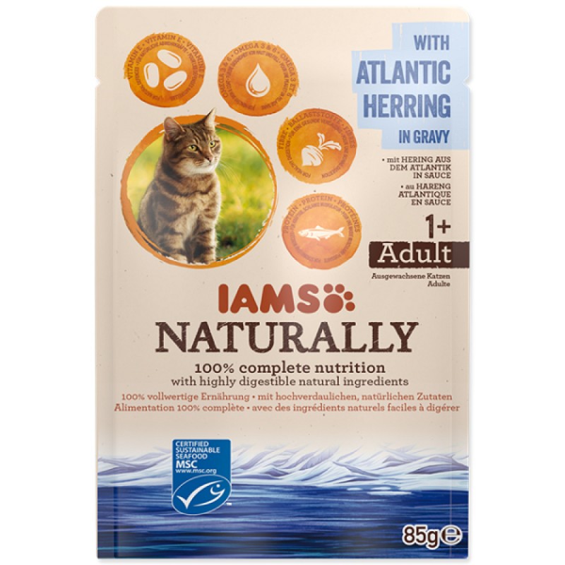 IAMS Naturally Adult Cat with Atlantic Herring in Gravy – visavertis ir subalansuotas konservuotas aukščiausios kokybės ėdalas suaugusioms katėms su atlanto silke padaže.