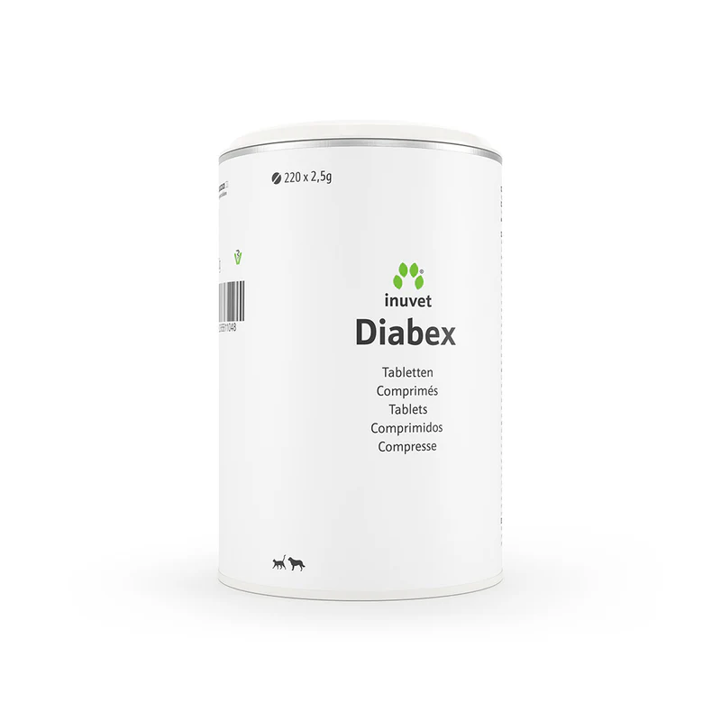 Katės svorisTablečių skaičius< 5kg1> 5kg2Šuns svorisTablečių skaičius< 5kg15–10kg210–20kg420–30kg630–40kg8Diabex tabletes duoti 15-30 minučių prieš valgį. Tablečių skaičių padalinkite į dienos valgymų skaičiųŠį papildą duokite palaipsniui.Jei reikia, tablečių skaičių šunims galima duoti dvigubai.Laikyti gyvūnams nepasiekiamoje vietoje. Nenaudokite imunosupresinio gydymo metu. Inkstų nepakankamumo atvejais stebėkite kalio kiekį. Ypač vartojant kartu su AKF inhibitoriais. Pagaminta Vokietijoje.
