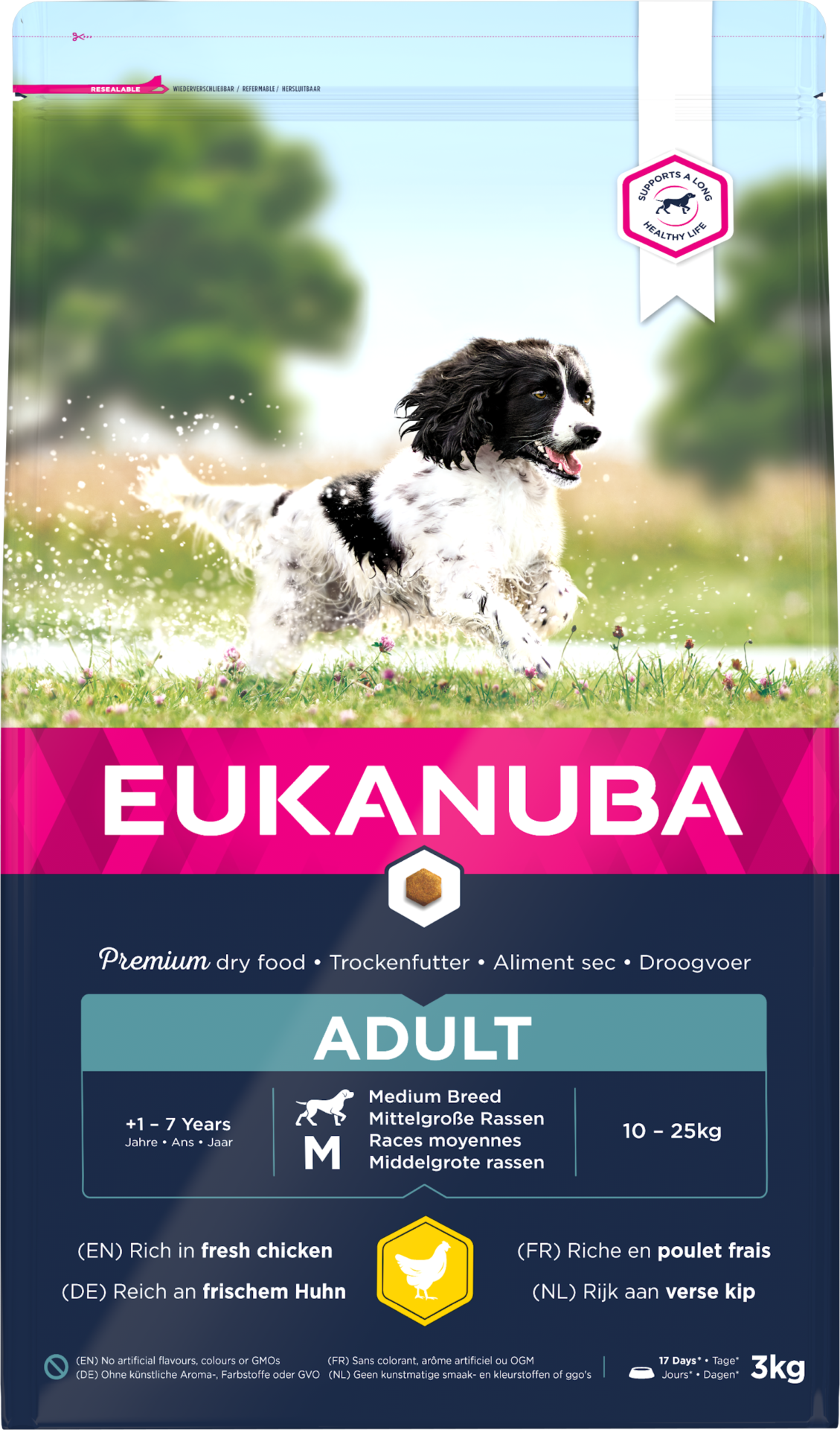 Džiovinta vištiena ir kalakutiena (23% įskaitant vištiena 14%, natūralus šaltinis gliukozaminas, chondroitino sulfatas ir taurinas), šviežia vištiena (17%), kukurūzai, kviečiai, paukščių riebalai, miežiai, sorgai, avižos, džiovinta cukrinių runkelių becukrė masė (3%), vištienos padažas, žuvų miltai (natūralus šaltinis omega-3 riebalų rūgštys), mineralai (įskaitant natrio heksametafosfatas 0.34% ), džiovintas kiaušinis, fruktooligosacharidai (0.25%, natūralus prebiotikas).