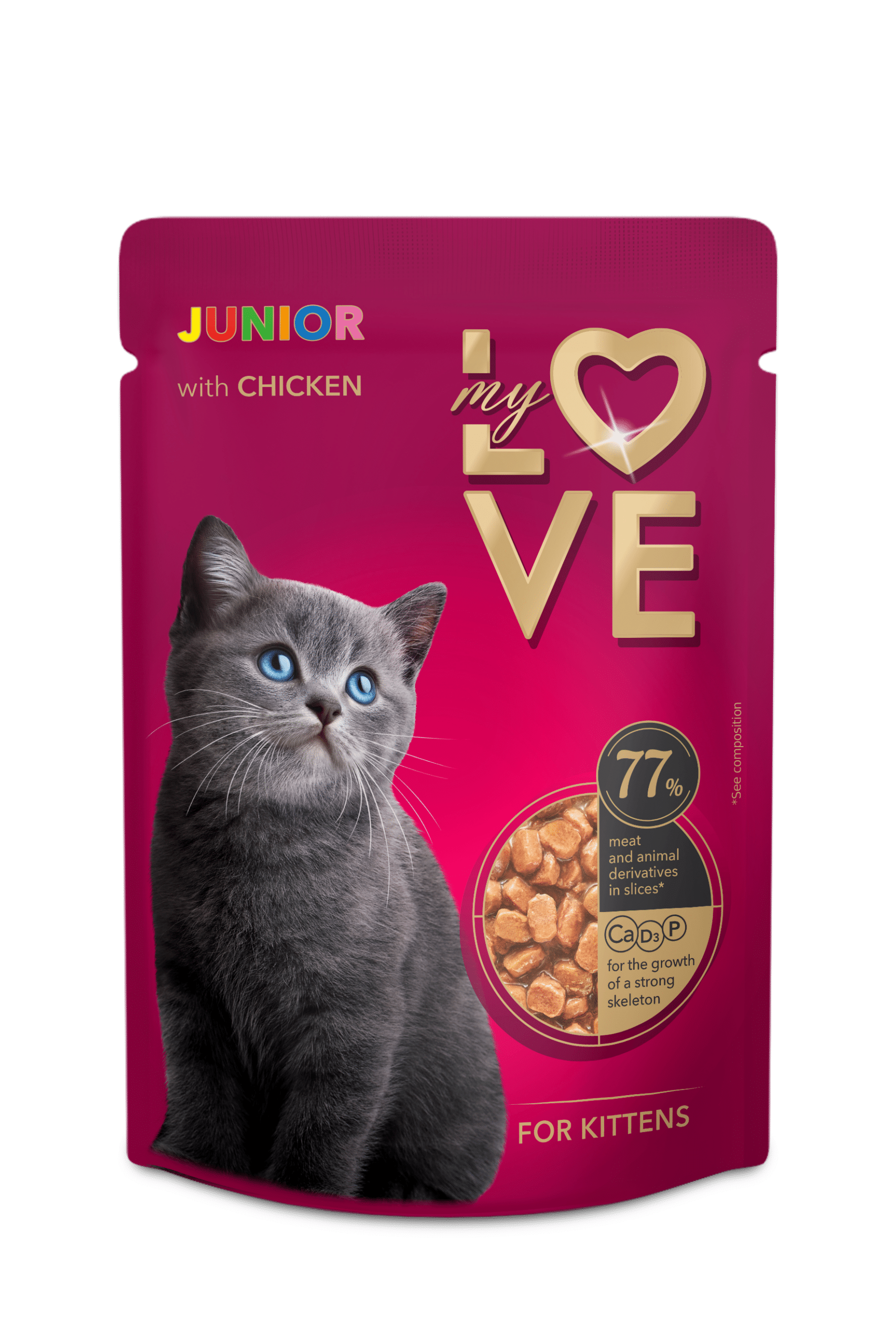 Sudėtis: 77 % mėsa ir mėsos perdirbimo produktai gabaliukuose (13 % vištienos), grūdai, augalinių baltymų ekstraktai, mineralai, augaliniai produktai.