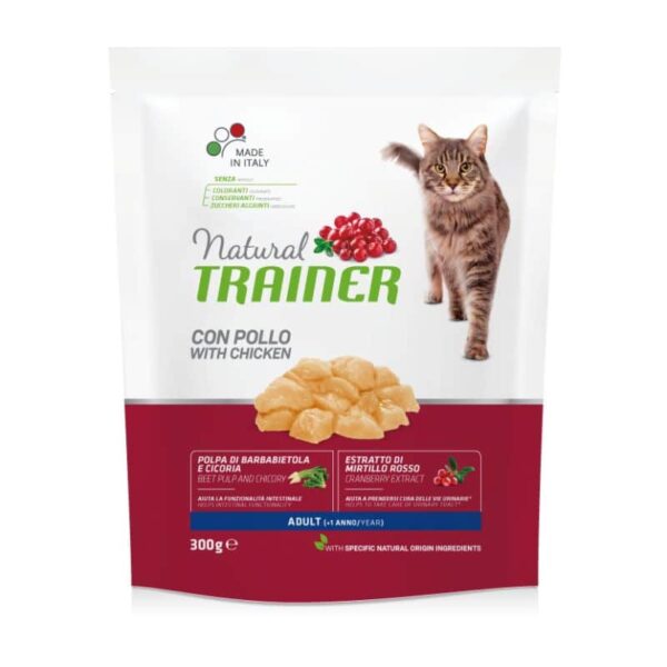TRAINER NATURAL CAT ADULT su vištiena – visavertis pašaras suaugusioms katėms nuo 1 metų amžiaus. Taip pat puikiai tinka sterilizuotoms katėms.