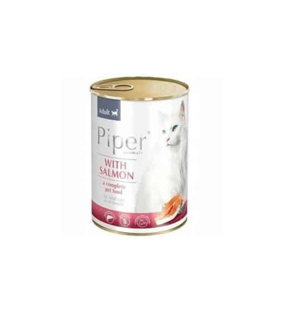 Piper visavertis maistas suaugusioms katėms su lašiša. Sudėtis: 55 % mėsos ir gyvūninės kilmės produktų, žuvis ir žuvies produktai (10% lašišos filė), mineralai. Analitinės sudedamosios dalys: baltymai – 11 %, neapdoroti aliejai ir riebalai – 6 %, žalia ląsteliena – 0,5 %, žali pelenai – 1,5 %, drėgnis – 80 %, kalcis – 0,3 %, fosforas – 0,25 %. Priedai/kg: maistiniai priedai: vitaminas D3 – 240 TV, vitaminas E – 95 mg, vitaminas C (askorbo rūgštis) – 550 mg, cinkas (glicerino hidrato cinko chelatas, cinko oksidas) – 13 mg, manganas (mangano sulfato monohidratas) – 0,5 mg, varis (vario sulfato pentahidratas) – 2 mg, jodas (bevandenis kalcio jodatas) – 0,4 mg, taurinas – 800 mg. Laikyti sausoje ir vėsioje vietoje, atidarius laikyti šaldytuve. Pagaminta Lenkijoje. |