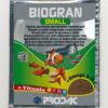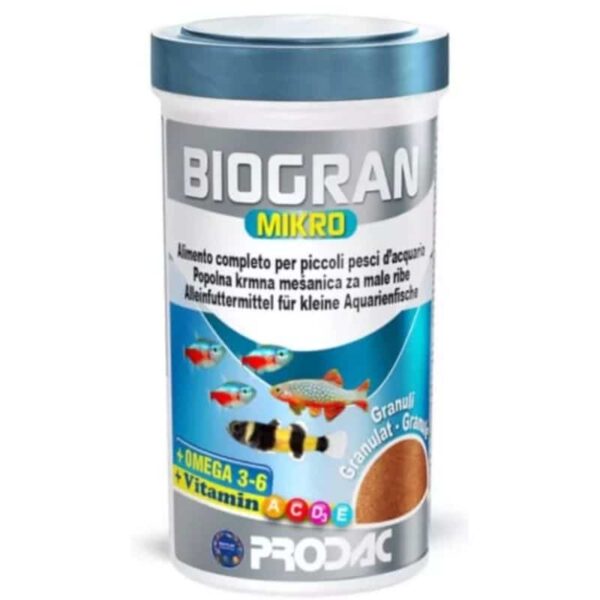 BIOGRAN MIKRO visavertis pašaras smulkioms žuvims. Mažoms gėlo vandens akvariumų žuvims.Sudėtis: žuvis ir žuvies produktai, grūdai, soja, vėžiagyviai, mielės, daržovės, dumbliai.Analitinės sudedamosios dalys: žalių baltymų 41.9%, žalių pelenų 7.82%, žalios ląstelienos 5.06%, žalių riebalų 3.91%, drėgnio 4.73%, Omega-6 1.37%, Omega-3 0.6%. Priedai/kg: maistiniai priedai: vitamino A (3a672a) 20000TV, vitamino D3 (3a671) 1500TV, vitamino E (3a700) 80mg, vitamino C (3a312) 50mg. Jutiminiai priedai: kantaksantino (2a161g) 80mg, dažikliai.Maitinimo informacija: po vieną žiupsnelį pašaro du ar tris kartus per dieną tokiu kiekiu, kad viskas būtų suvalgyta iškart. Laikyti šaltoje vėsioje vietoje.