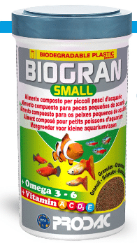 BIOGRAN SMALL sudėtinis pašaras granulėmis gėlavandenėms ir jūrinėms mažoms žuvims. Ypatingai tinka ciklidams.Sudėtis: žuvis ir jos produktai ,javai, soja, vėžiagyviai, mielės, daržovės, jūros dumbliai. EEC dažančios medžiagos. Analitinės sudedamosios dalys: žalių baltymų 43,5%, žalių riebalų 5.49%, žalios ląstelienos 4,01%, žalių pelenų 8,73%, drėgnio 4,13%, Omega-6 20,3%, Omega-3 8,49%.Maistiniai priedai 1-ame kg: vit.A 41.500TV, vit.D3 1.600TV, vit.E 267mg, vit.C-274mg.Naudojimas: 1-2 žiupsneliai per dieną. Laikyti šaltoje vėsioje vietoje.