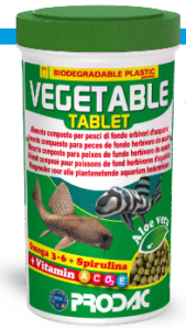VEGETABLE TABLET sudėtinis pašaras tabletėmis dugninėms žolėdėms tropinėms žuvims.Sudėtis: javai, žuvis ir jos produktai, soja, mielės, vėžiagyviai, dumblių 0.8%, alavijo 0,05%. EEC dažančios medžiagos.Analitinės sudedamosios dalys: žalių baltymų 45,1%, žalių riebalų 5.02%, žalios ląstelienos 1,76%, žalių pelenų 4,15%, drėgnio 8,26%.Maistiniai priedai 1-ame kg: vit.A 46.000TV, vit.D3 4.000TV, vit.E 280mg, vit.C 200mg.Naudojimas: 2-3 tabl. per dieną, priklausomai kiek yra žuvų akvariume. Laikyti šaltoje vėsioje vietoje.