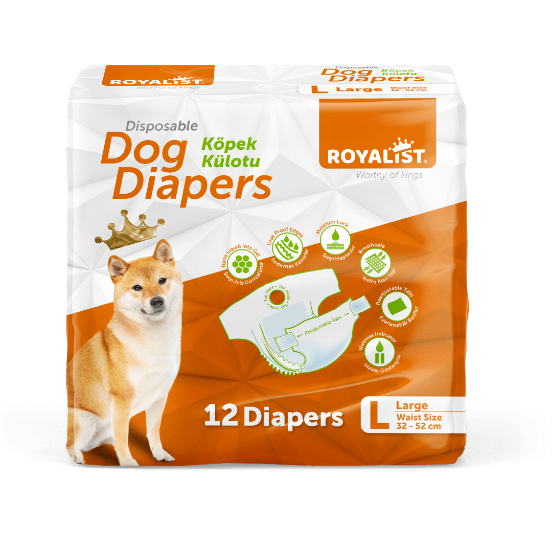 Royalist Dog Diapers L N12 (juosmens apimtis: 32-52 cm)Palaiko jūsų šuns komfortą dėl kvėpuojančios medžiagos. Skystį paverčia geliu, kontroliuoja kvapą ir apsaugo nuo bakterijų dauginimosi. Užrakina drėgmę viduje ir palaiko sveiką jūsų šuns odą. Puikiai pritaikoma šuniui reguliuojamų juostelių pagalba. Apsaugo nuo pratekėjimo dėl apsauginių kraštų. Drėgmės indikatorius pakeičia spalvą, kai reikia pakeisti sauskelnes.