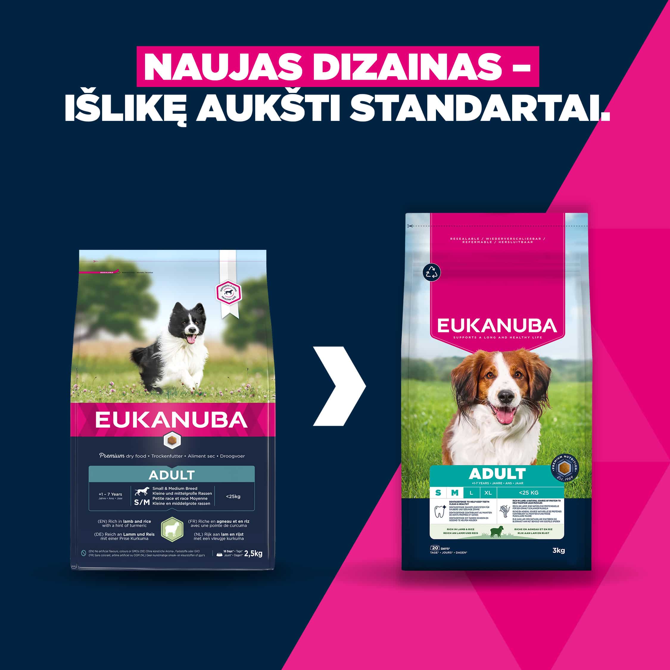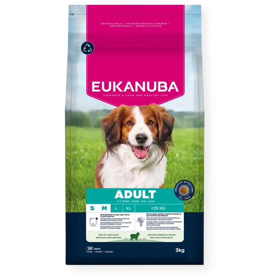 Džiovinta vištiena ir kalakutiena (natūralus šaltinis gliukozaminas (207mg/kg)), ėriena (14%), ryžiai (14%), kukurūzai, sorgai, miežiai, kiaulienos riebalai, džiovintas kiaušinis, žuvų miltai, džiovinta cukrinių runkelių becukrė masė (2.6%), vištienos padažas, mineralai (įskaitant natrio heksametafosfatas 0.35%), fruktooligosacharidai (0.25%), mananoligosacharidai (0.13%), dažinė ciberžolė (0.1%).