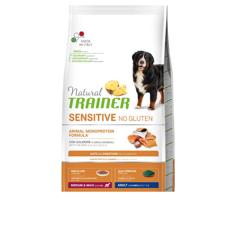 TRAINER NATURAL ADULT DOG SENSITIVE NO GLUTEN M/M SALMON (LAŠIŠA) – visavertis ir subalansuotas pašaras suaugusiems vidutinių ir didelių veislių šunims.