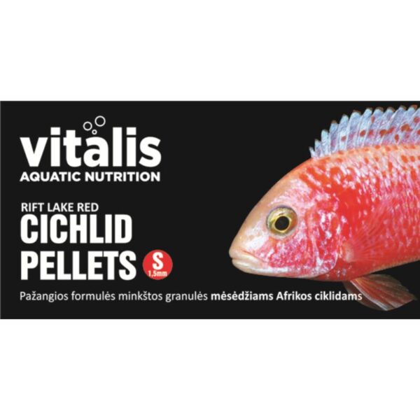 Visavertis pašaras mėsėdžiams Centrinės/Pietų Amerikos ir Afrikos ciklidams.Savybės ir nauda: Unikali lėtai skęstančių minkštų granulių formulė. Mažiau atliekų – geresnė vandens kokybė. Natūralūs, patvirtintos kilmės ingredientai. Šėrimo instrukcijos: Visavertis pašaras žuvims, tinkamas visų rūšių grobuonėms, mėsėdėms ciklidų rūšims. Maitinti iki trijų kartų per dieną, nedėti drėgnų pirštų į pašaro indelį. Neperšerti. Pašalinti nesuėsto pašaro likučius. Laikyti vėsioje, sausoje, vaikams nepasiekiamoje vietoje. Ne žmonių naudojimui.Sudėtis: Žuvys ir žuvų perdirbimo produktai, augaliniai produktai, aliejai ir riebalai, moliuskai ir vėžiagyviai.Analitinės sudedamosios dalys: žali baltymai 38.5%, žali riebalai 9.8%, žali pelenai 9.8%, žalia ląsteliena 1.5%, drėgnis 23.6%.Priedai/kg: Maistiniai priedai: vitaminas A 12605TV, vitaminas D3 1681TV, vitaminas E 168TV, cinkas (3b605) 126mg, manganas (3b503) 84mg, geležis (3b103) 75mg, jodas (3b202) 4.2mg, varis (3b405) 0.5mg, selenas (3b801) 0.08mg. Jusliniai priedai: dažikliai. Technologiniai priedai: konservantai.